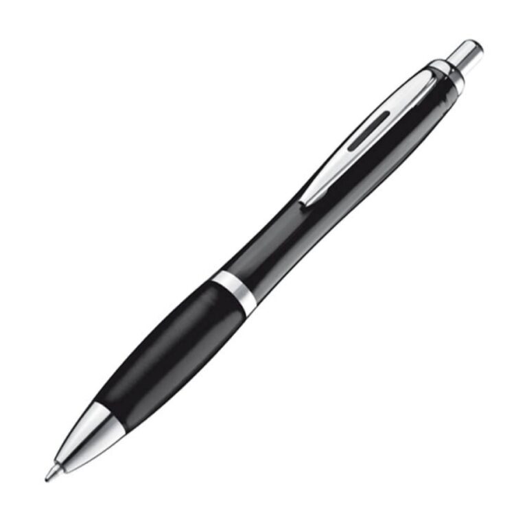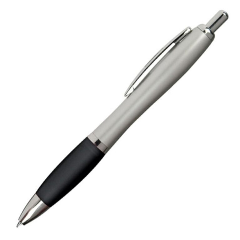 Długopis plastikowy z antypoślizgową gumką oraz z błyszczącymi elementami. Wyposażony w system typu kilk oraz wkład w kolorze niebieskim. Długopis dostępny w bogatej gamie kolorystycznej.