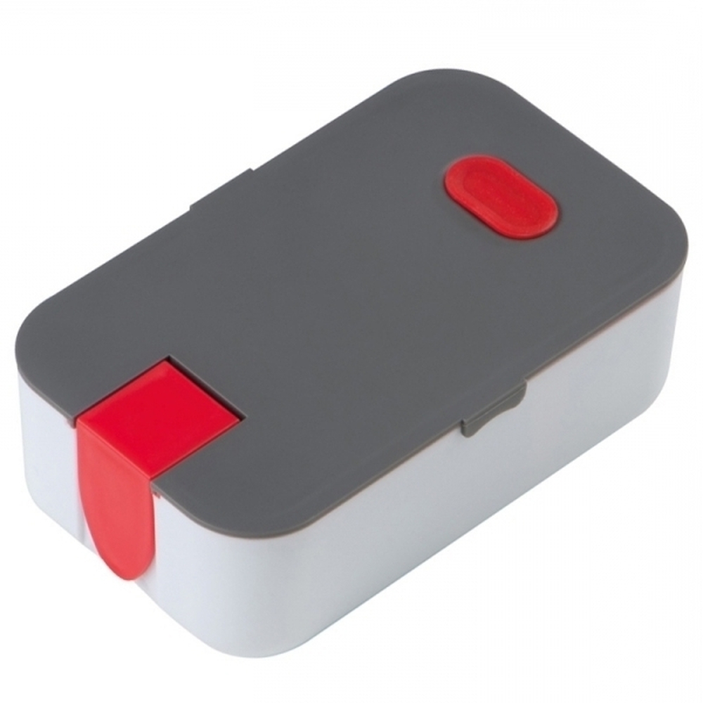 Plastikowy pojemnik na jedzenie o pojemności 850ml z silikonowymi elementami oraz stojakiem na telefon. Dostępny w różnych kolorach.