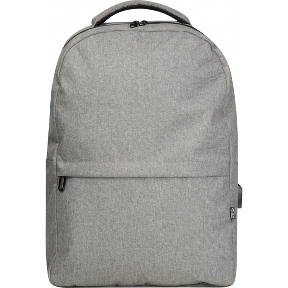 Plecak wykonany z materiały RPET z wyjściem na kabel USB, watowanymi szelkami i plecami oraz specjalną kieszenią na laptopa.