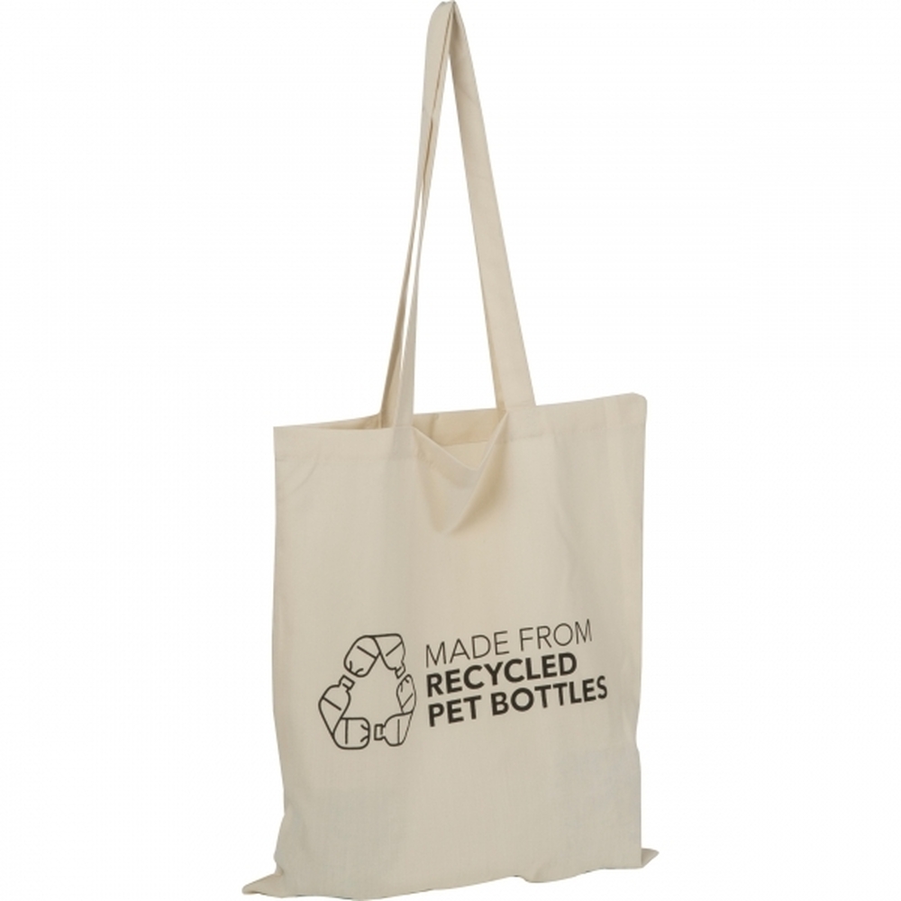 Torba wykonana z RPET pochodzącego z recyklingu, z nadrukiem MADE FROM RECYCLED BOTTLES.